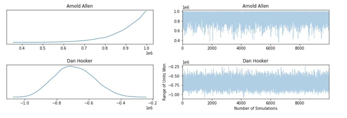 I ran a simulation of this fight 10,000 times (see x axis) with the price of the fighters and their chance to win the fight against each other with their odds price. Allen has a chance of winning back his bet money, whereas Hooker is priced so high (at roughly -110) that he will not win his money back in 10,000 fights! In simpler terms, Allen will not win all the time, but it is more likely for him to provide a profit at these prices than Hooker. Our Bayesian Simulation and Markov Chain Simulation show it is best to bet on Arnold Allen due to his price and winning percentage under these circumstances. It may be best to wait and see what BCDC machine learning models pick due to the success they have. (The BCDC machine learning models’ recent picks have ~69% accuracy and overall accuracy of 62%.)